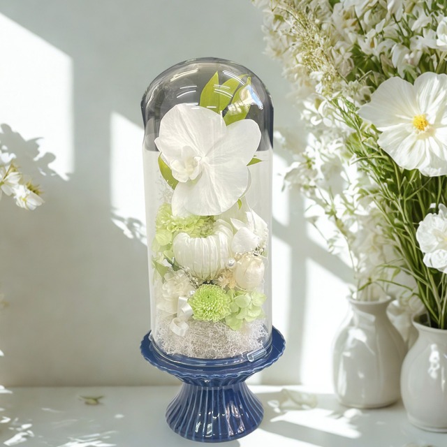 手のひらサイズの可愛らしい【御供】プリザーブドフラワーは、ガラスドームに美しく収められたミニアレンジメントです。